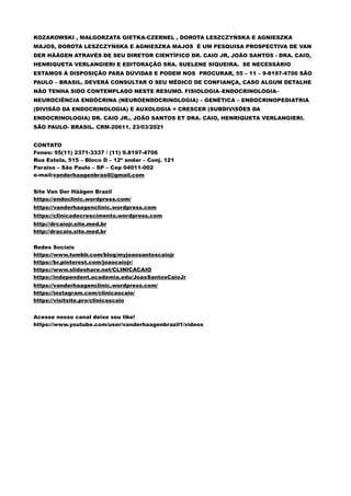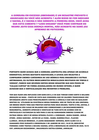 O documento discute a obesidade, as vacinas contra doenças mortais, e a importância de consultar médicos especialistas. Critica visões negacionistas da ciência e recomenda a consulta a profissionais de saúde confiáveis. Fornece detalhes de contato de uma clínica médica no Brasil.
