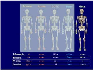 O documento discute a gota, uma doença inflamatória causada por cristais de ácido úrico. Apresenta sua epidemiologia, fisiopatologia, manifestações clínicas, exames complementares, diagnóstico e tratamento. Relata também o caso clínico de Ronaldo desde sua primeira consulta aos 32 anos até os 56 anos, quando desenvolveu poliartrite e insuficiência renal devido à gota.