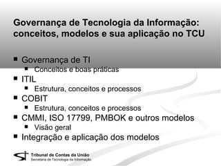 O documento discute conceitos e modelos de governança de tecnologia da informação (TI) e sua aplicação no Tribunal de Contas da União (TCU). Apresenta definições de governança de TI e discute sua importância para assegurar o alinhamento entre negócios e TI. Também aborda estruturas, processos e comunicação relacionados à governança de TI e fatores que influenciam sua maturidade e sucesso na organização.