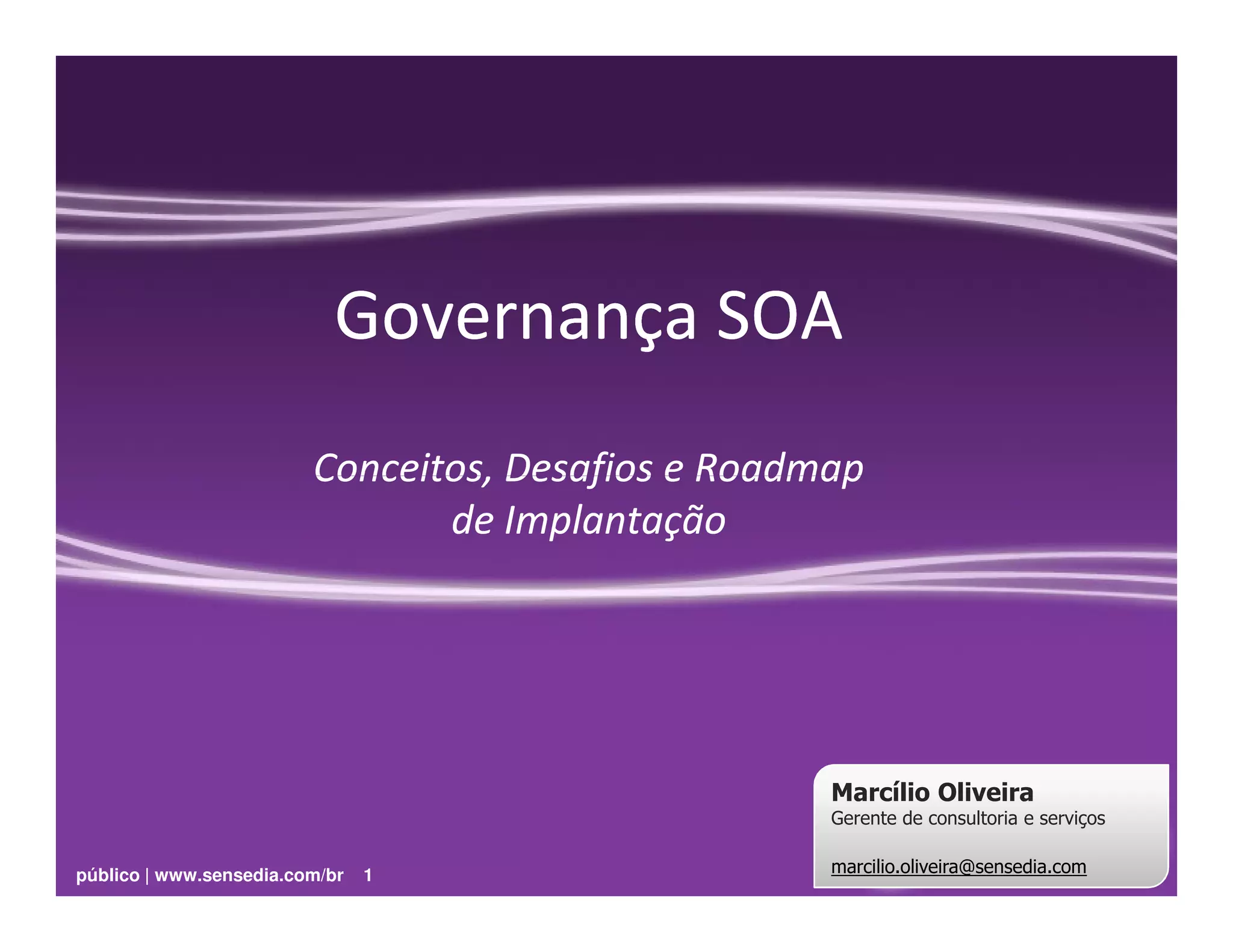 O documento discute a importância da governança SOA para o sucesso de projetos, identificando erros comuns e propondo uma abordagem incremental de design e melhoria contínua da governança.