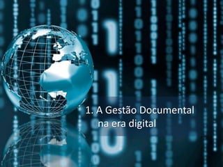 O documento discute a gestão documental na era digital, destacando como as rápidas mudanças tecnológicas estão a transformar a produção e uso da informação. A citação de Frederick Lancaster enfatiza a necessidade de as organizações planearem a transição para sistemas de informação digitais de forma ordenada e evolutiva para evitar futuros problemas. O documento também aborda temas como a governança da informação e os desafios de lidar com a crescente quantidade e complexidade dos dados.