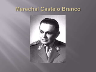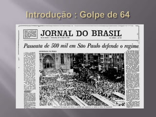 O documento descreve os principais acontecimentos do período de 1964-1967 no Brasil, quando o governo militar implementou os Atos Institucionais que suspenderam direitos políticos e civis e concentraram mais poder nas mãos do presidente, incluindo a abolição dos partidos políticos e a eleição indireta para a presidência e governos estaduais.