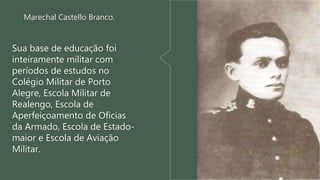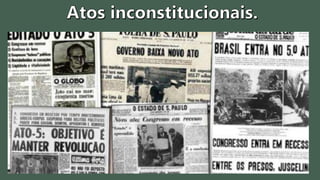 O documento descreve os governos militares de Castello Branco e Costa e Silva no Brasil entre 1964-1969. Durante este período, os militares assumiram o controle do governo após o golpe de 1964 e implementaram medidas repressivas como a censura, a cassação de direitos políticos e o fortalecimento do aparato de segurança do Estado.