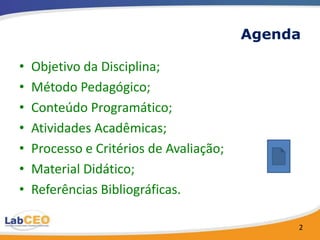 O documento apresenta o plano de ensino da disciplina de Gerenciamento de Projetos aplicados à Engenharia de Produção. Ele descreve o objetivo da disciplina, o método pedagógico, os conteúdos programáticos, as atividades acadêmicas, o processo e critérios de avaliação e as referências bibliográficas. O foco é desenvolver habilidades de gerenciamento de projetos de engenharia compatíveis com estratégias competitivas.
