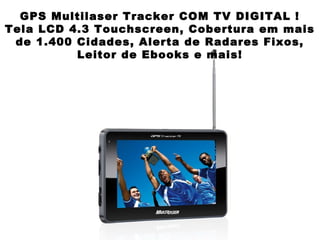 O GPS Multilaser Tracker possui tela LCD de 4.3 polegadas com touchscreen e cobre mais de 1.400 cidades. Inclui funções como alerta de radares fixos e leitor de ebooks. Mais informações estão disponíveis no site da empresa e no canal do YouTube.