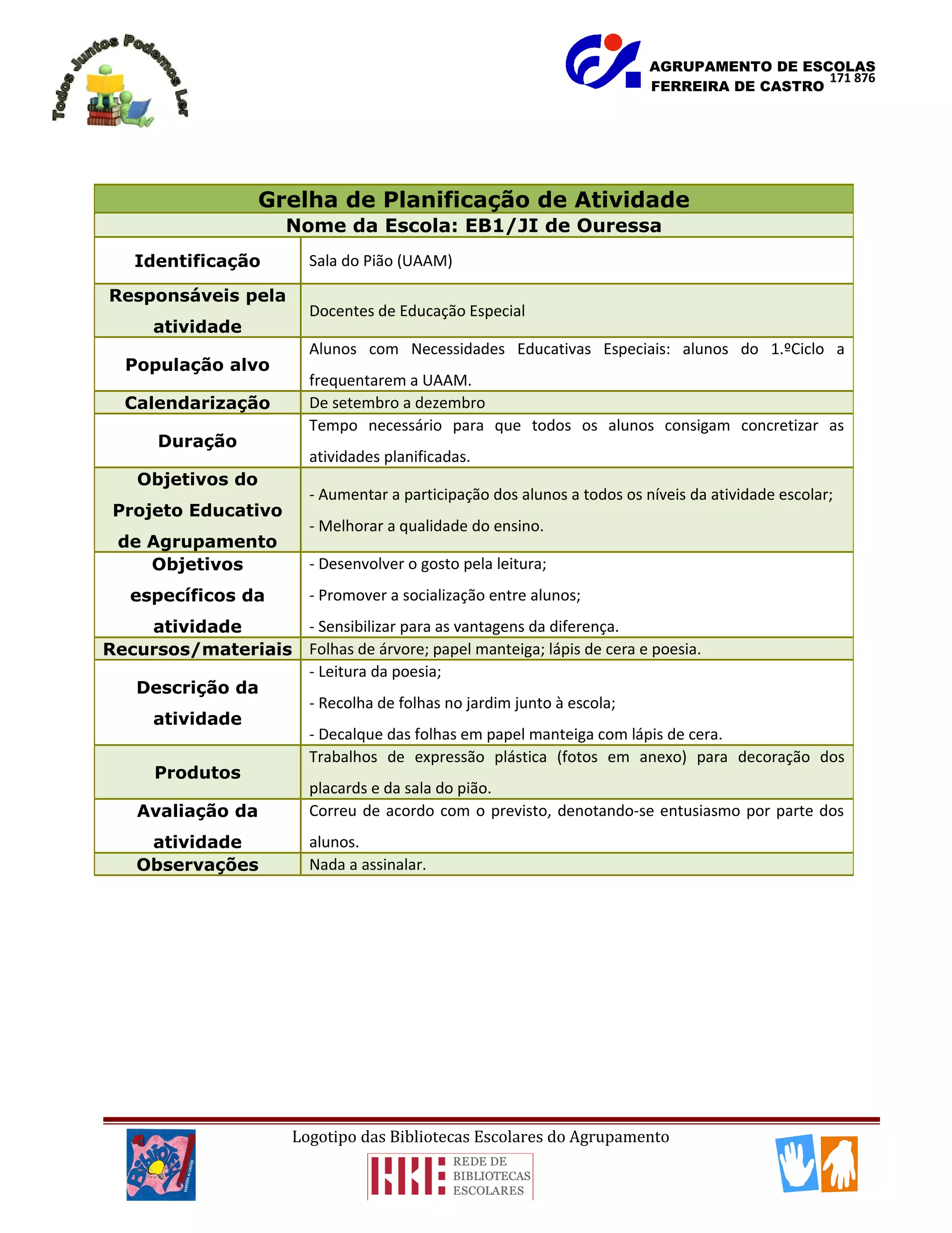 O documento descreve um projeto educativo no agrupamento de escolas Ferreira de Castro, focado na leitura e socialização de alunos com necessidades educativas especiais. A atividade envolve leitura de poesia e atividades práticas como decalque de folhas, programadas para o período de setembro a dezembro. O projeto visa aumentar a participação dos alunos e melhorar a qualidade do ensino, tendo sido avaliado positivamente quanto ao entusiasmo dos estudantes.