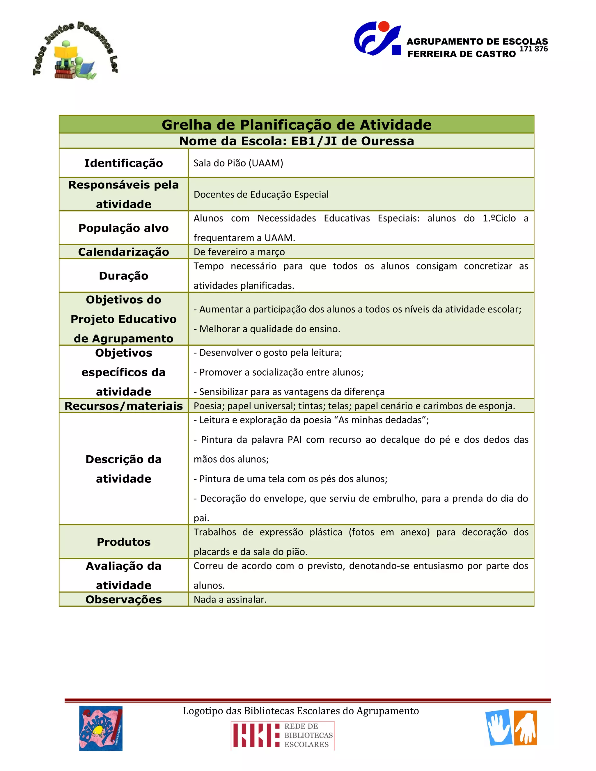 A atividade promoveu a leitura, socialização e aceitação da diferença entre alunos com Necessidades Educativas Especiais. Os alunos pintaram a palavra "PAI" usando os pés e dedos, pintaram telas com os pés, e decoraram envelopes para presentes do Dia do Pai. A atividade correu como planejado e os alunos mostraram entusiasmo.