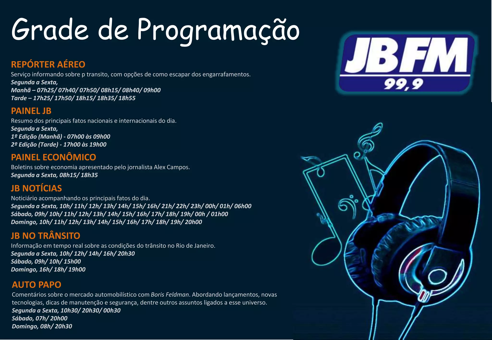 O documento apresenta a grade de programação da rádio JB FM, com noticiários, programas sobre trânsito, economia, saúde, esportes e cultura durante a semana, fins de semana e madrugadas. Inclui também programas musicais com estilos como MPB, disco e rock.