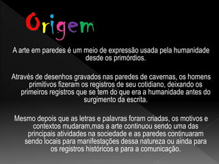 A arte em paredes tem sido usada desde os primórdios, com desenhos nas cavernas registrado o cotidiano dos homens primitivos. Ao longo da história, outras formas de registros em paredes foram utilizadas, como hieróglifos egípcios e afrescos. Modernamente, o grafite surgiu como forma de expressão e protesto, apesar de ser visto por muitos apenas como vandalismo.