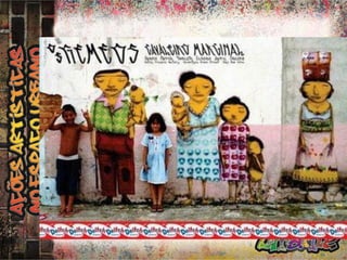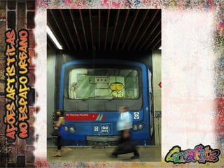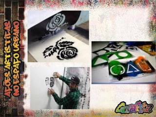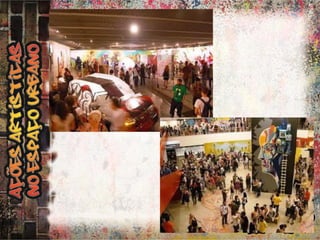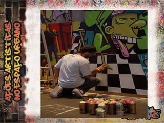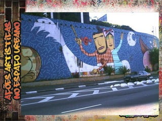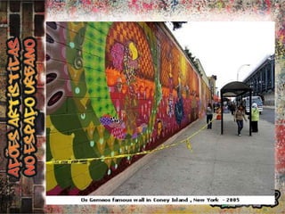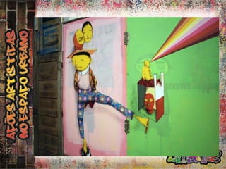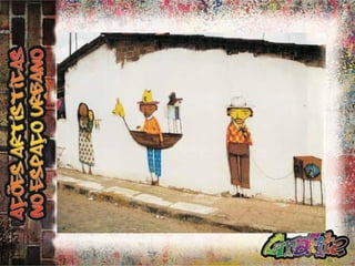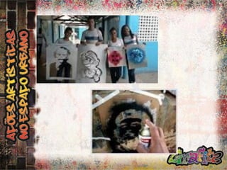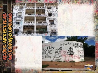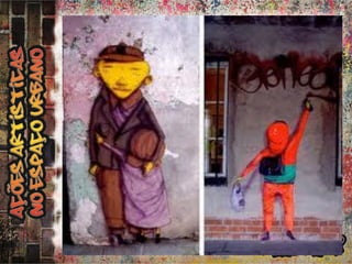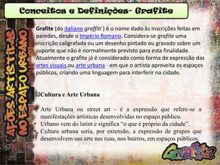 O documento discute os conceitos de grafite e pichação, definindo grafite como uma forma de arte urbana e expressão, enquanto pichação é considerada vandalismo. Apresenta exemplos de obras de grafiteiros brasileiros renomados e discute como museus e empresas têm dado oportunidades para que artistas expressem seu trabalho.