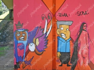 O documento discute a arte do grafite, definindo-a como uma forma de manifestação artística em espaços públicos que surgiu em Nova Iorque na década de 1970. O grafite está ligado ao movimento Hip Hop e expressa a realidade das ruas, especialmente dos menos favorecidos. Embora alguns vejam o grafite como vandalismo, outros o consideram uma qualidade artística.