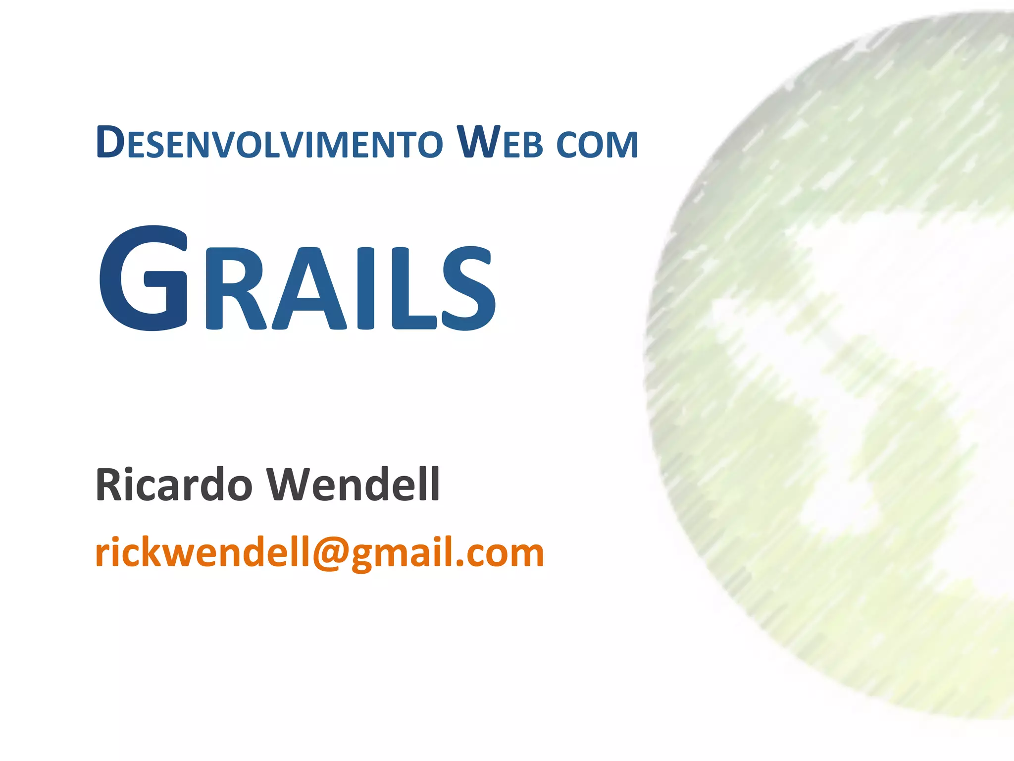 O documento apresenta o framework Grails para desenvolvimento web. Grails é construído em cima do Spring e foca em produtividade através de convenções, ferramentas de código e linguagem dinâmica Groovy. O documento descreve os principais componentes de Grails como modelagem de domínio, mapeamento objeto-relacional, serviços, scripts de criação e plugins.