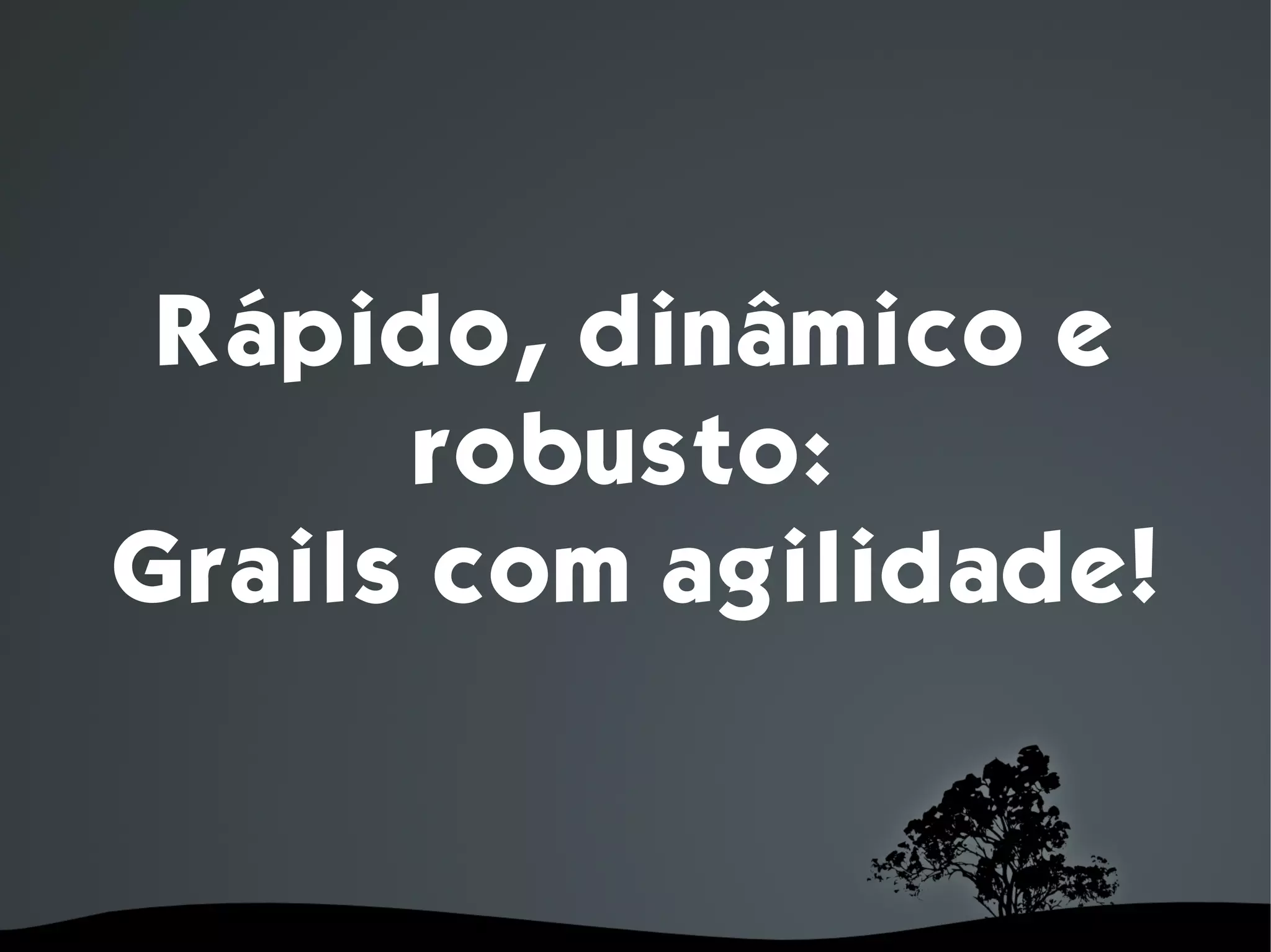 Grails é um framework web para desenvolvimento rápido de aplicações Java com foco em agilidade e convenções. Ele combina o dinamismo de Groovy com o poder do Spring Framework e Hibernate para permitir que desenvolvedores construam e implantem aplicações robustas de forma rápida.