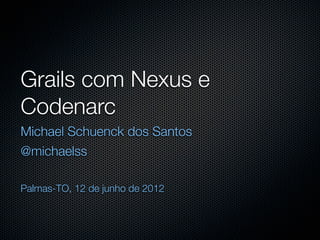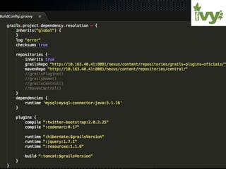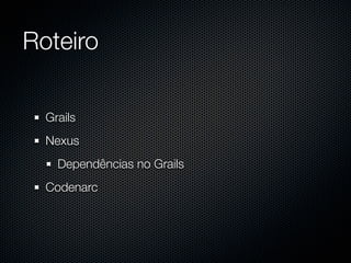 [1] O documento discute o framework Grails, o gerenciador de dependências Nexus e a ferramenta de análise estática Codenarc. [2] O Grails é um framework web para desenvolvimento rápido de aplicações com Groovy e convenções sobre configurações, enquanto o Nexus gerencia repositórios de artefatos como bibliotecas e plugins do Grails. [3] A Codenarc analisa código Groovy em busca de defeitos, más práticas e estilos de codificação não padronizados.