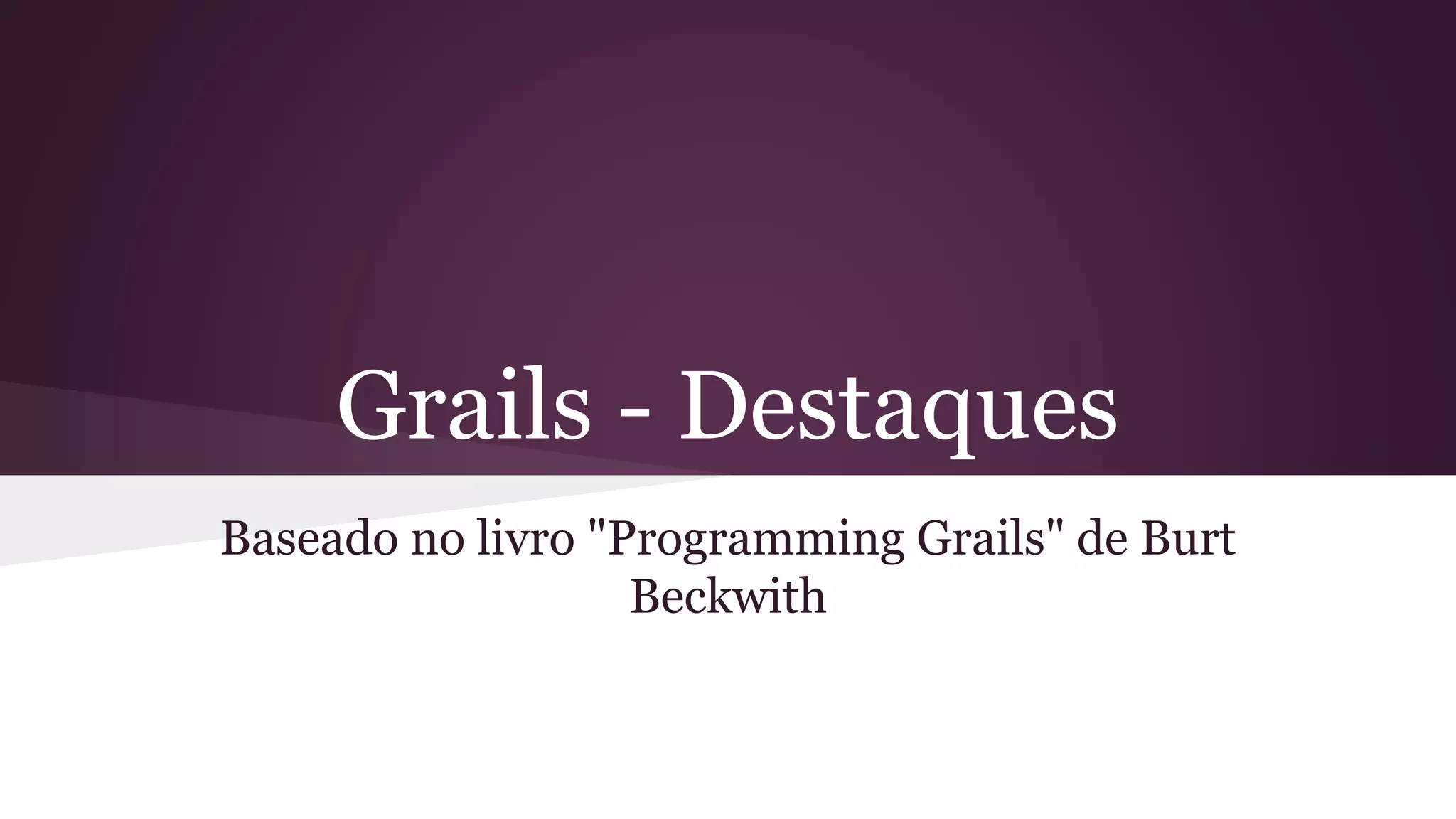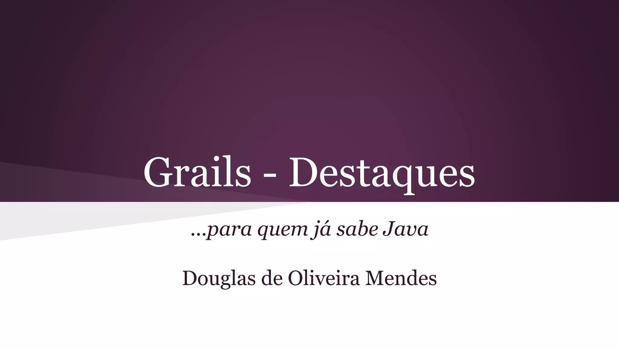 O documento apresenta os principais recursos da linguagem Groovy e do framework Grails, destacando como o código fica mais conciso graças ao uso do dialeto Groovy e da convenção sobre configuração. Também descreve recursos como closures, operadores como ?. e ?:, e como a reflexão torna o acesso a propriedades e métodos mais simples.