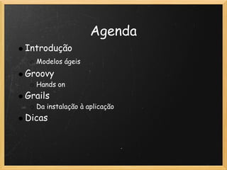 O documento introduz o framework Grails, começando por explicar os princípios ágeis e o que é ser ágil. Em seguida, apresenta a linguagem Groovy e como o Grails utiliza Groovy e padrões como convention over configuration para ser leve e produtivo. Por fim, explica os principais recursos do Grails como domain classes, controllers, validações e o ORM.