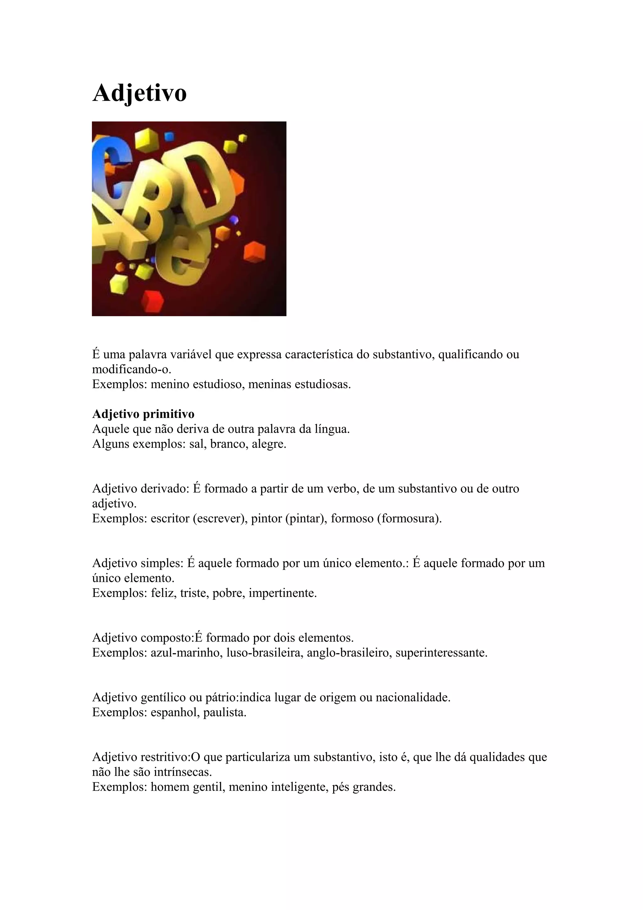 O documento descreve as principais características dos adjetivos em português, incluindo sua definição, classificação em primitivos e derivados, formação do feminino e plural, graus de comparação e superlativo. Explica como adjetivos podem qualificar substantivos e são flexionados de acordo com o gênero e número desses substantivos. Fornece exemplos de cada tipo e forma de adjetivo.