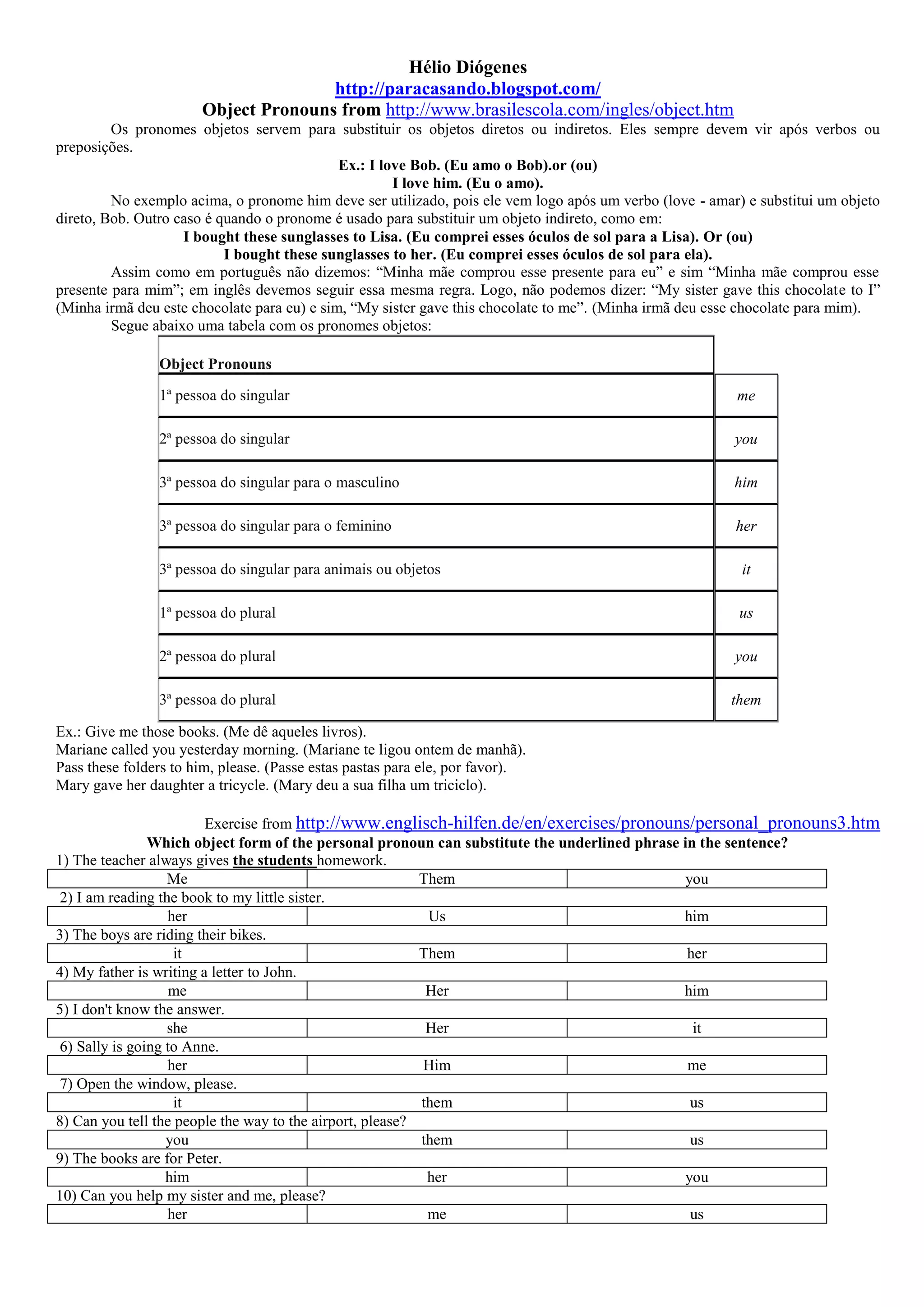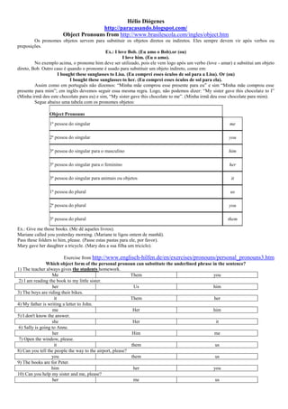 O documento descreve o uso de pronomes objetos em inglês. Ele lista os pronomes objetos de acordo com a pessoa e número e fornece exemplos de como substituir nomes por esses pronomes em frases. O documento também inclui um exercício para treinar o uso correto dos pronomes objetos.