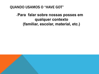 O documento descreve como usar "have got" para falar sobre posses. Ele explica as formas afirmativa, negativa e interrogativa de "have got" e fornece exemplos de cada uma. A forma abreviada é usada na oralidade e a forma completa na escrita. Respostas curtas começam com "Yes" ou "No" seguido do sujeito e "have" ou "haven't".