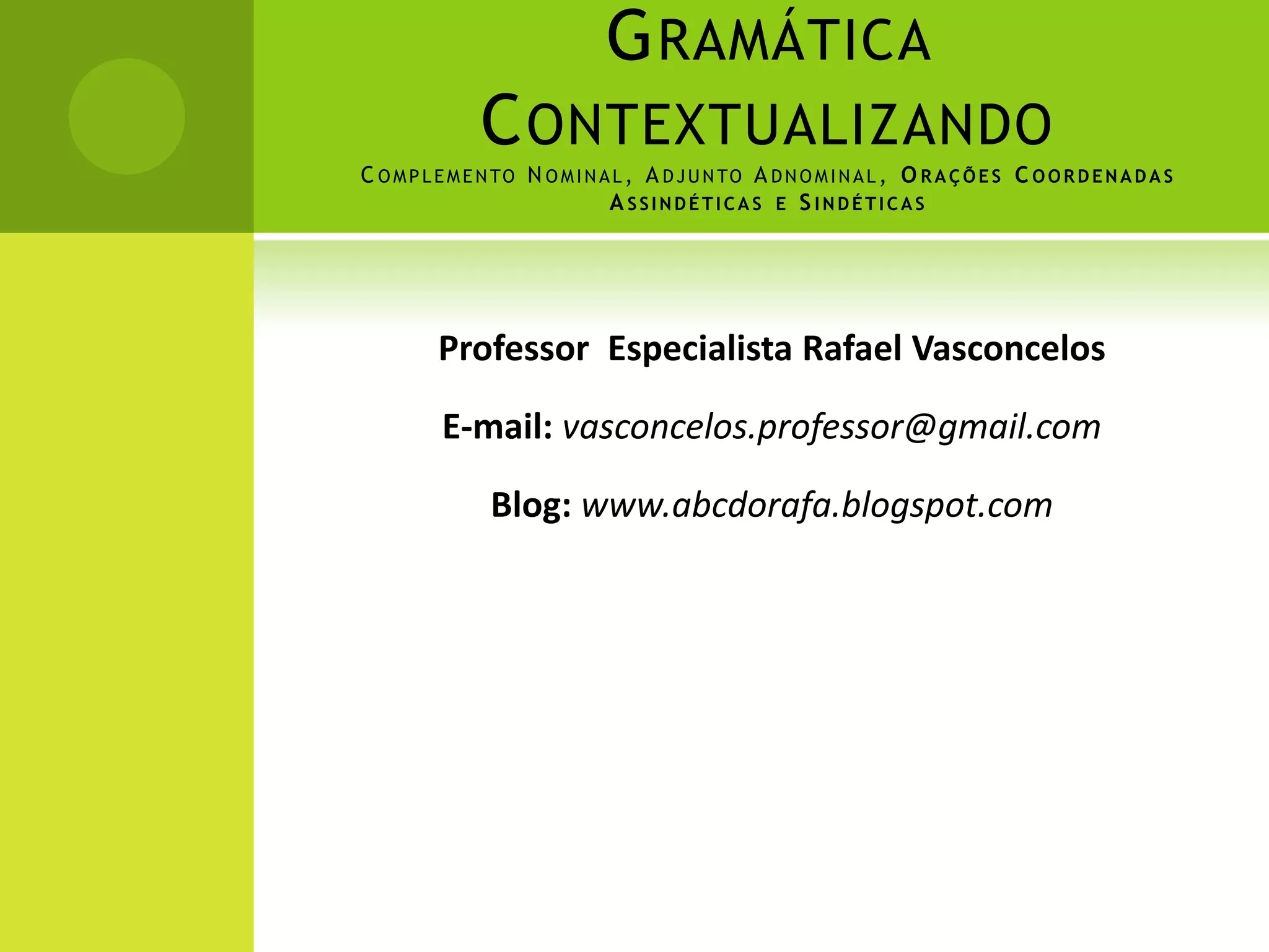 O documento discute três tópicos gramaticais: 1) Complemento nominal, que completa o sentido de substantivos, adjetivos ou advérbios através de preposições; 2) Adjunto adnominal, que modifica substantivos com artigos, adjetivos ou numerais; 3) Orações coordenadas assindéticas e sindéticas, onde as últimas são ligadas por conjunções e classificadas em aditivas, adversativas, alternativas, conclusivas e explicativas.