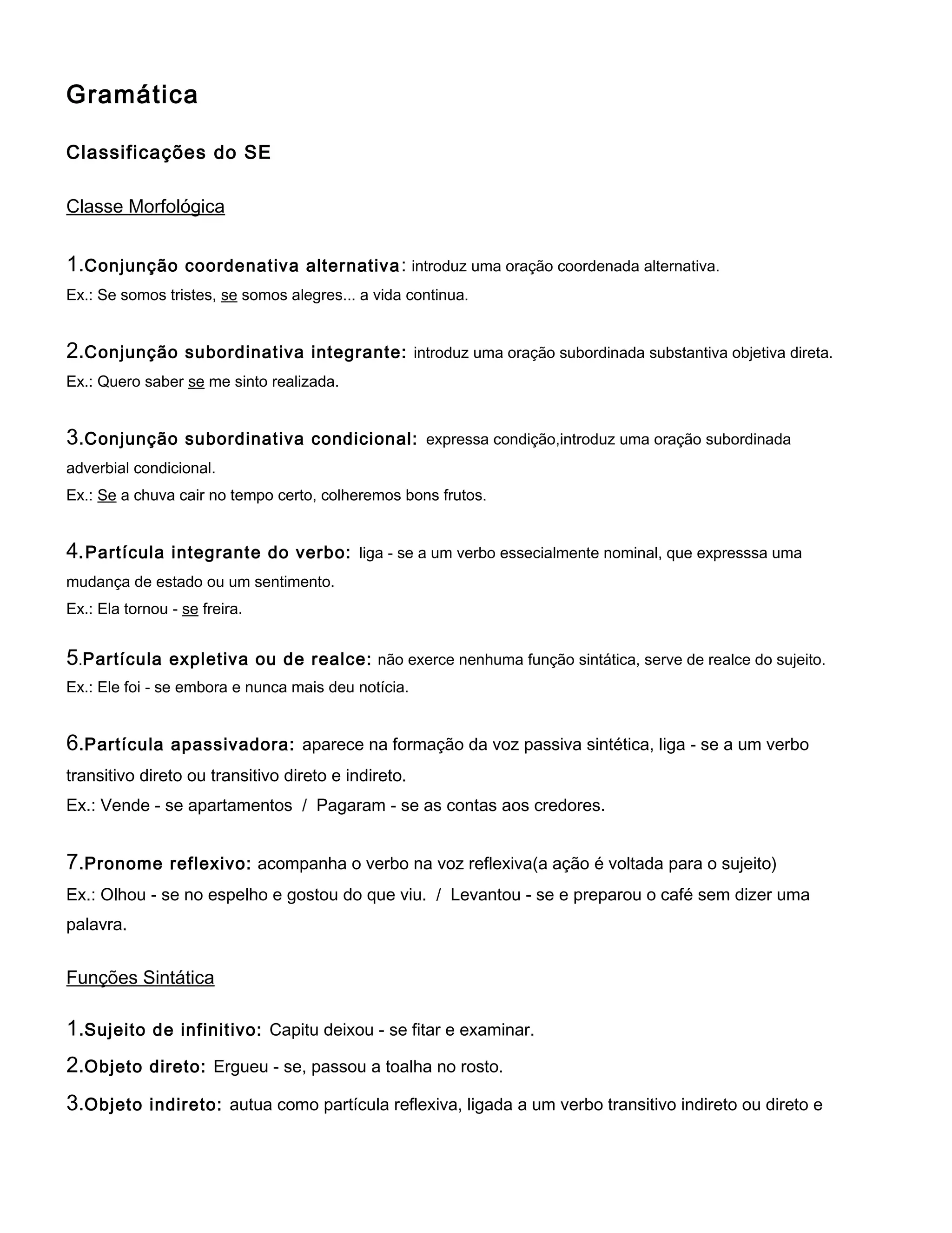 1. O documento descreve as classificações gramaticais e funções sintáticas de conjunções e partículas como "se" e "que" no português. 2. Inclui exemplos de como "se" pode ser usado como conjunção, partícula reflexiva ou apassivadora. 3. Também explica as diferentes classificações morfológicas de "que" como advérbio, substantivo, preposição ou pronome e suas funções sintáticas associadas.