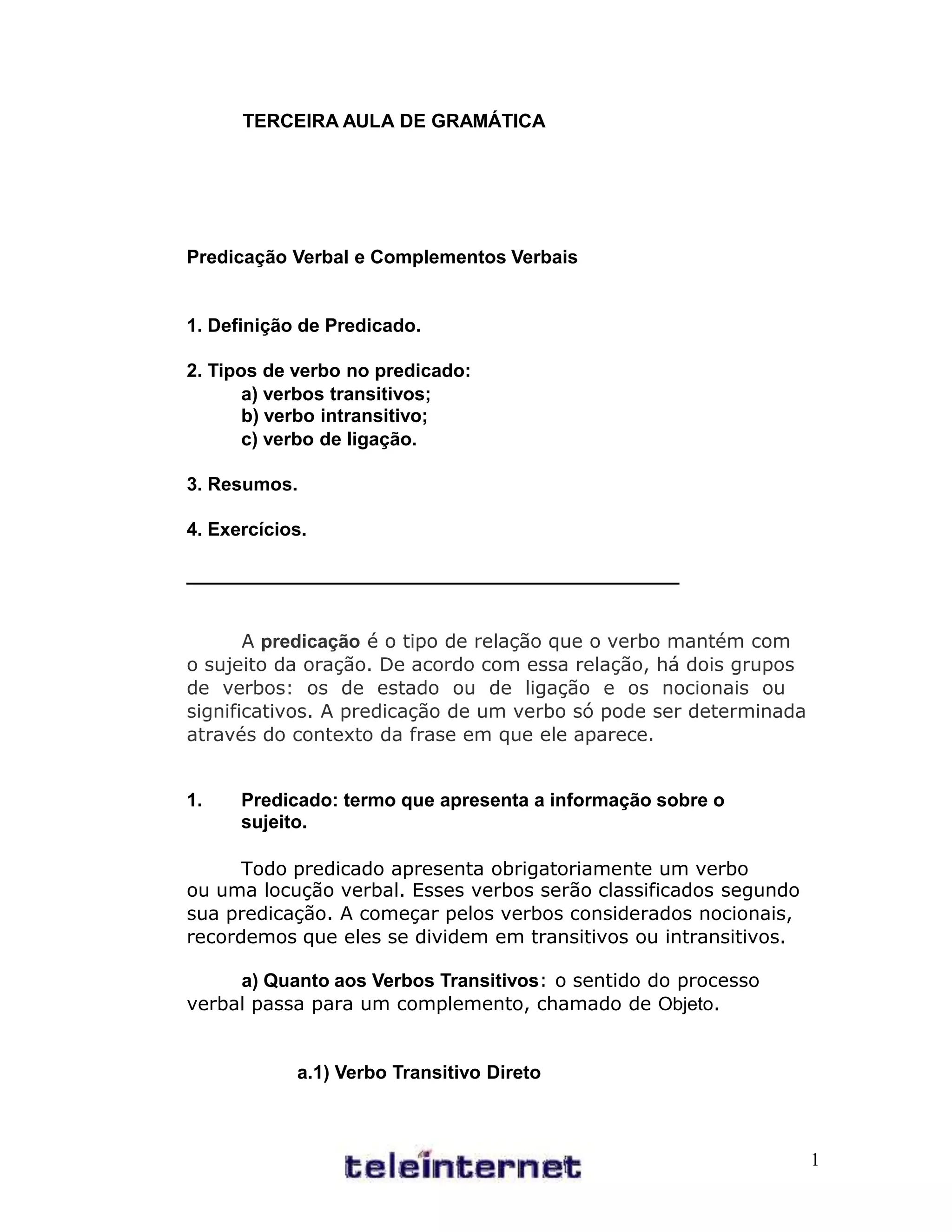 1) Definições de predicado e tipos de verbos no predicado - transitivos, intransitivos, de ligação.
