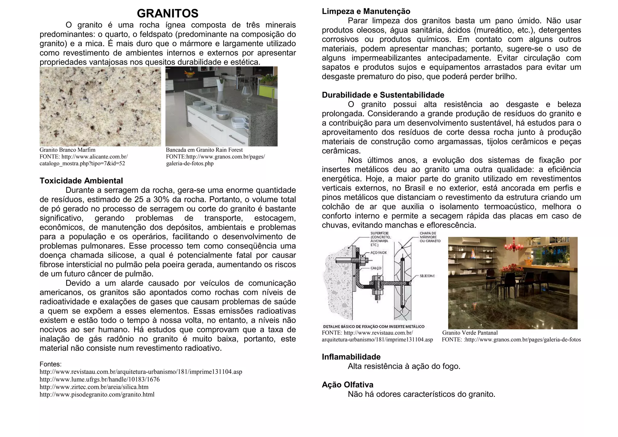 O documento descreve as propriedades do granito, incluindo sua composição mineral predominante, durabilidade, manutenção e riscos à saúde durante o processo de corte. O granito é uma rocha ígnea dura e resistente ao desgaste, mas seu corte gera muita poeira de sílica, podendo causar doenças pulmonares. Deve-se evitar produtos químicos para limpeza e usar apenas pano úmido.