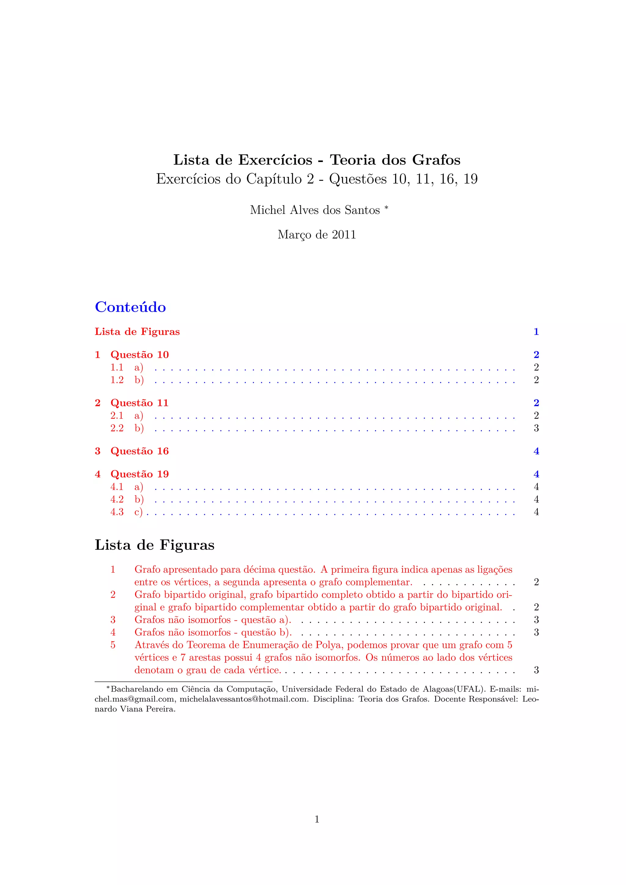 O documento apresenta resumos de exercícios de teoria dos grafos, incluindo: 1) a definição de grafo complementar e bipartido complementar; 2) critérios para isomorfismo de grafos; 3) definição de grafo fortemente conexo e exemplos.
