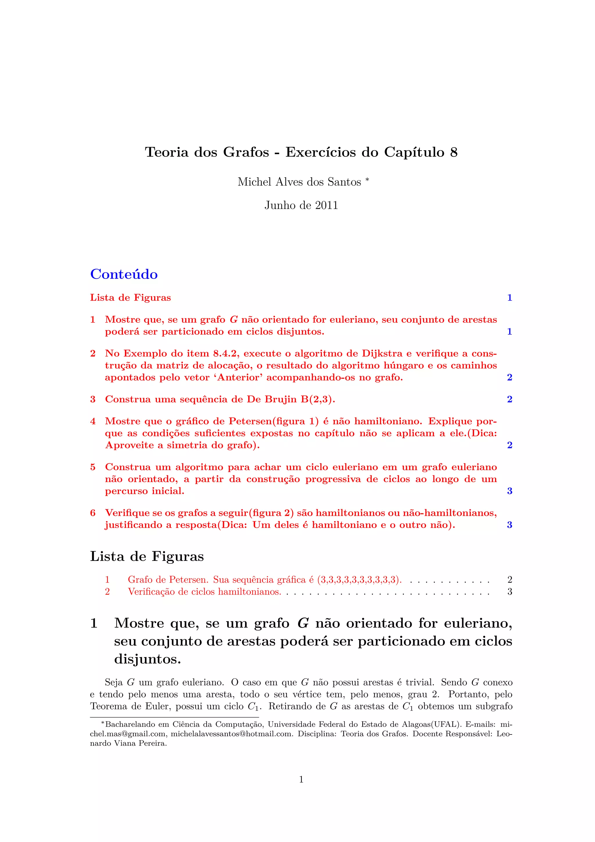 O documento discute exercícios sobre teoria dos grafos. Aborda particionamento de arestas em grafos eulerianos, algoritmo de Dijkstra em um exemplo, sequência de De Brujin, grafo de Petersen não hamiltoniano e algoritmo para encontrar ciclo euleriano.