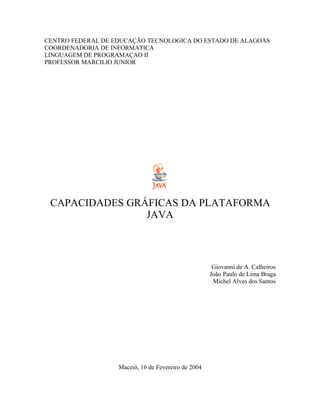 O documento aborda as capacidades gráficas da plataforma Java, destacando as diferenças entre AWT e Swing, além de detalhar suas características, componentes e funcionamento. AWT é considerado limitado em performance e portabilidade, enquanto Swing oferece uma gama mais ampla de componentes e maior flexibilidade no design de interfaces gráficas. O texto também discute a importância de gerenciadores de eventos e layout na criação de aplicações GUI em Java.
