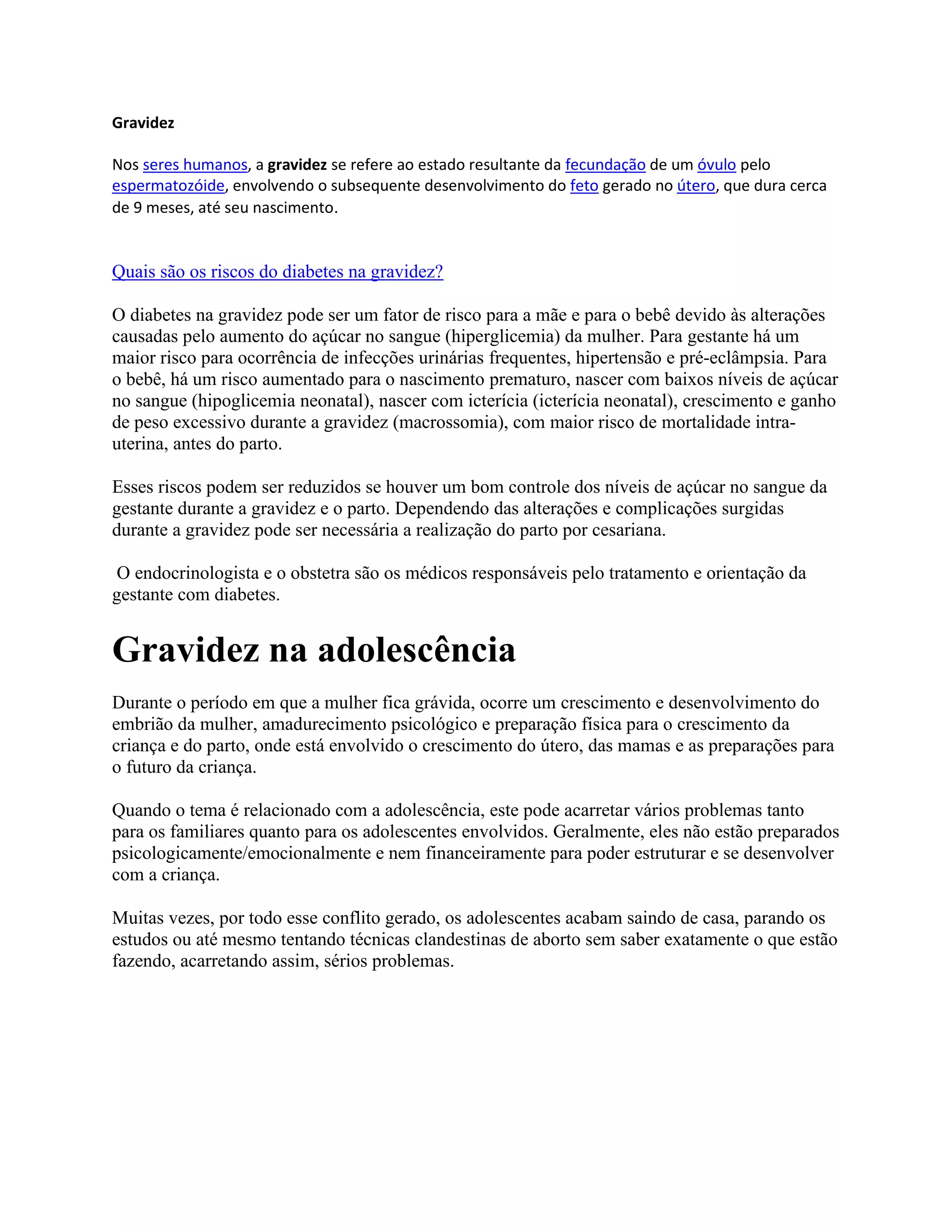 O documento discute os riscos do diabetes na gravidez para a mãe e o bebê, incluindo infecções urinárias frequentes, hipertensão e pré-eclâmpsia na mãe, e nascimento prematuro, baixos níveis de açúcar no sangue, icterícia neonatal e crescimento excessivo no bebê. Um bom controle dos níveis de açúcar no sangue pode reduzir esses riscos.