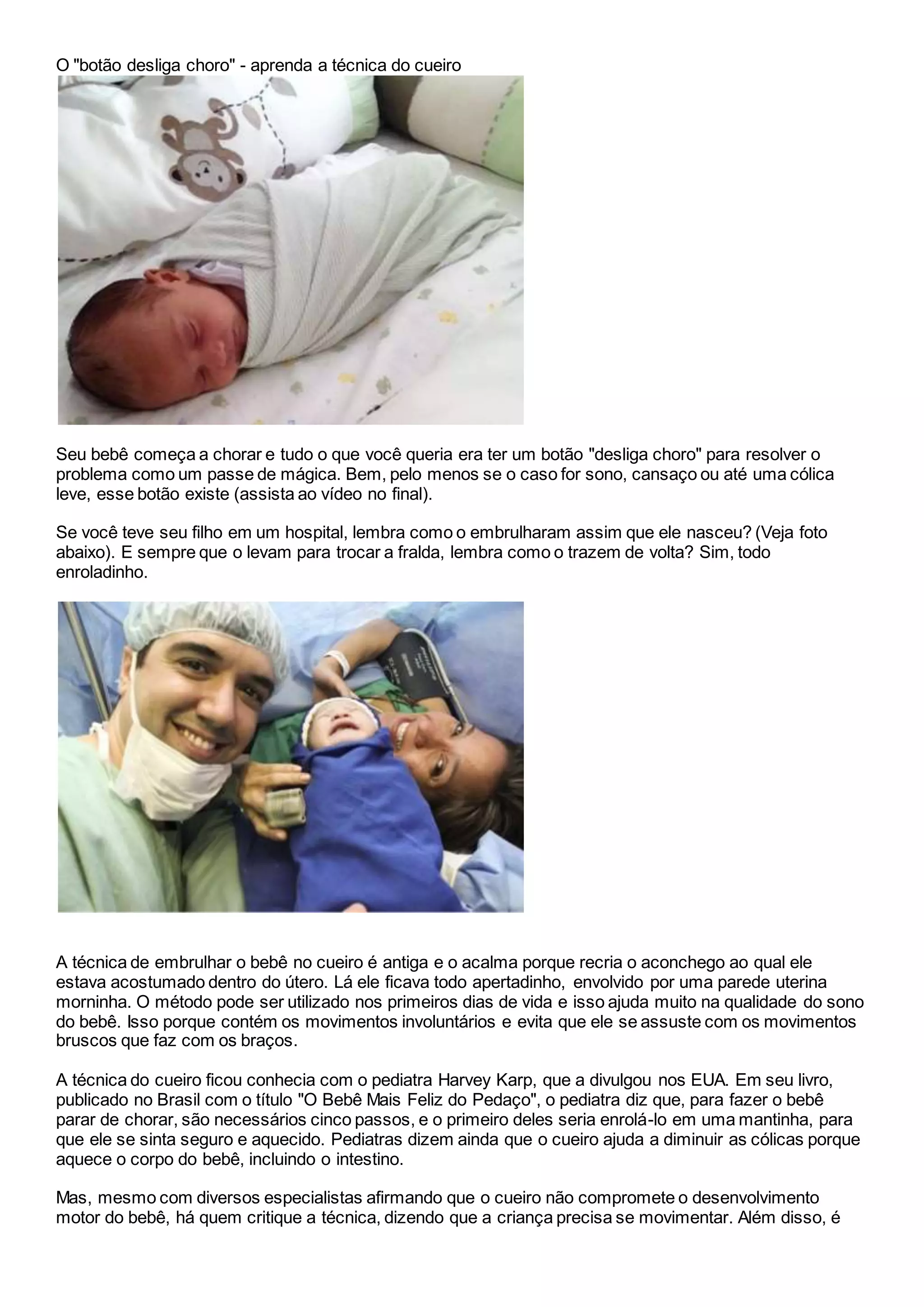 O documento descreve a técnica do "cueiro", que envolve embrulhar o bebê em uma manta para acalmá-lo, recriando o ambiente quente e apertado do útero materno. A técnica ajuda o bebê a dormir melhor, aliviando choro, cólicas e movimentos involuntários. O documento fornece instruções passo a passo sobre como embrulhar corretamente o bebê no cueiro.