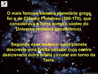 O documento aborda a evolução dos modelos do sistema planetário, desde o geocentrismo de Ptolomeu até o heliocentrismo de Copérnico e as contribuições de Kepler, que formulou três leis sobre o movimento dos planetas, incluindo a elipticidade de suas órbitas. Essas leis foram fundamentais para a compreensão da gravitação universal proposta por Isaac Newton, que descreveu a força gravitacional entre dois corpos. A fórmula da gravitação universal estabelece que a força de atração é proporcional ao produto das massas dos corpos e inversamente proporcional ao quadrado da distância entre eles.