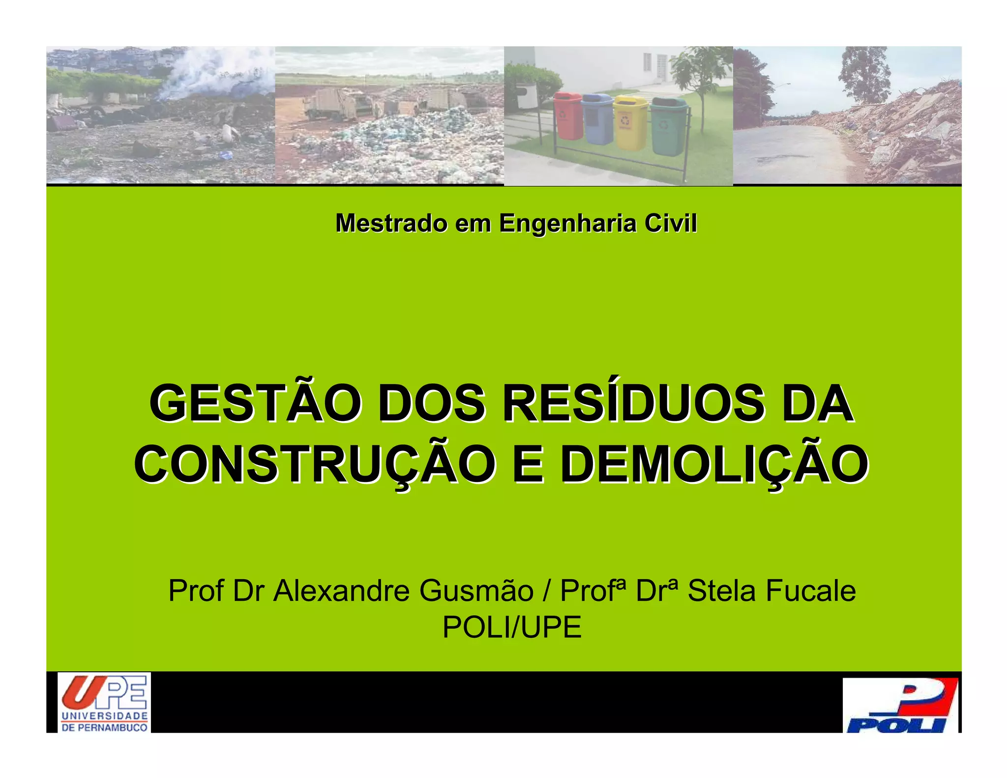 O documento discute a gestão dos resíduos da construção e demolição. Trata dos impactos ambientais causados por esses resíduos, como a poluição do ar, solo e água. Apresenta também a classificação dos resíduos da construção e as diretrizes para o seu correto destino final, visando a sustentabilidade no setor da construção civil.