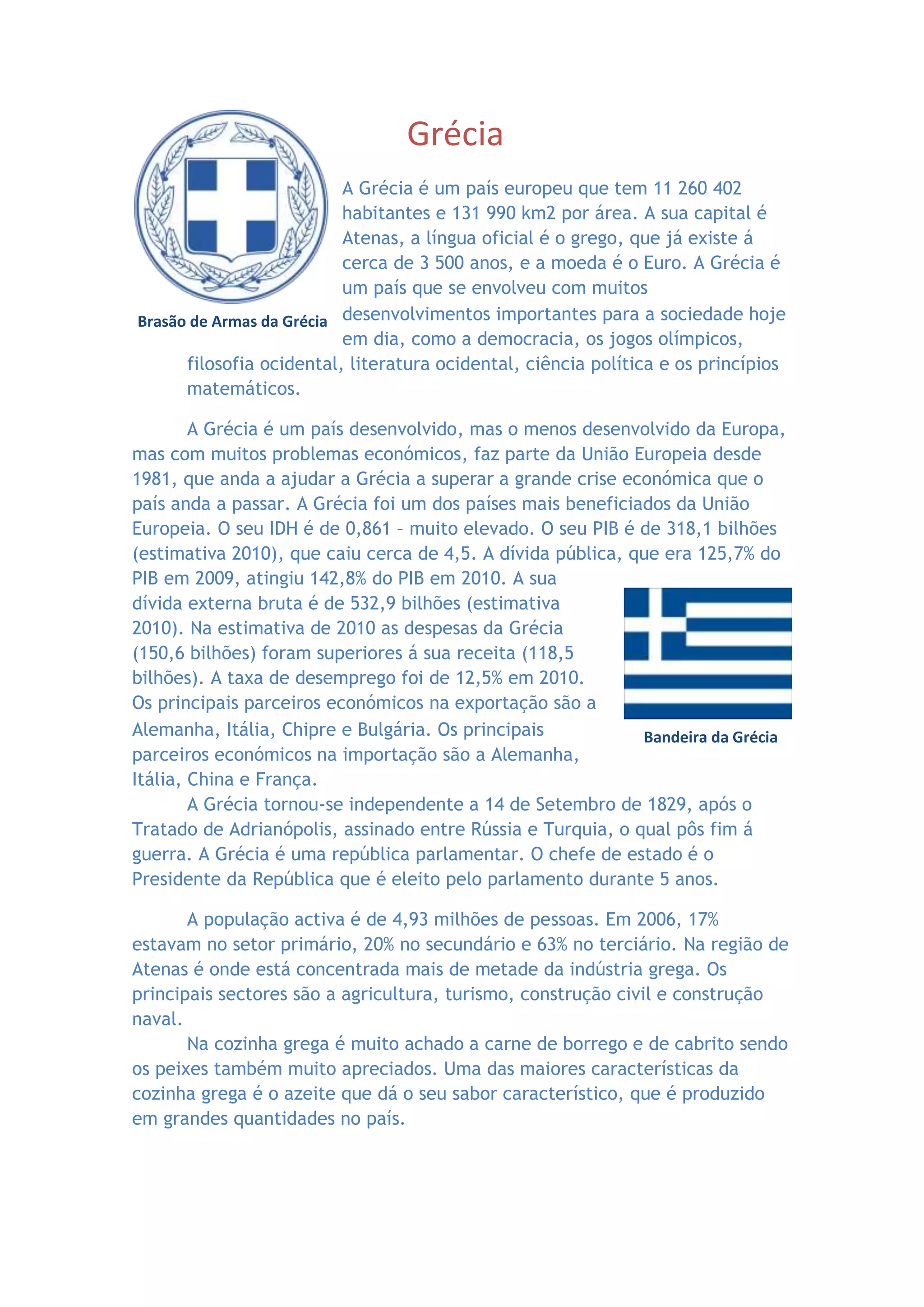 A Grécia é um país europeu com 11 milhões de habitantes e capital Atenas, que usa o Euro. A Grécia desenvolveu importantes conceitos como democracia e jogos olímpicos, mas atualmente enfrenta graves problemas econômicos. A maioria da população é cristã ortodoxa e a economia se baseia em agricultura, turismo e construção.