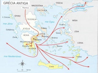 A Grécia antiga localizava-se no sudeste da Europa, com terreno montanhoso e pouco fértil. Sua geografia favoreceu o isolamento de cidades-estados independentes e o comércio marítimo. A civilização grega teve origem em povos que se estabeleceram no território a partir de 2000 a.C, dando origem ao povo grego.