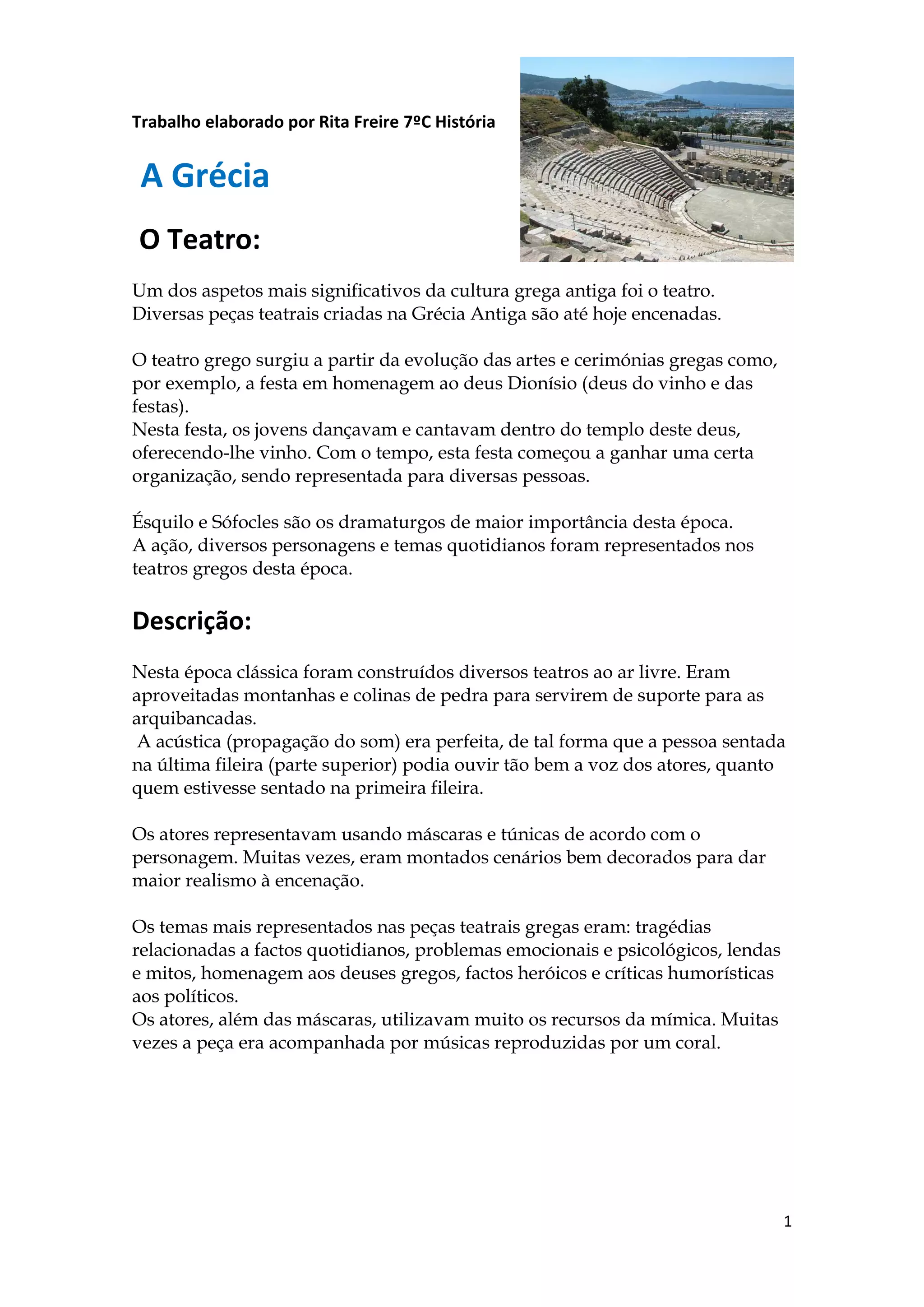 O documento descreve a cultura e história da Grécia Antiga, focando no teatro, filosofia e historiadores mais importantes. O teatro grego surgiu de festivais para Dionísio e se desenvolveu em teatros ao ar livre onde eram encenadas tragédias e comédias com máscaras e música. A filosofia grega enfatizou a razão e indagação e influenciou o pensamento ocidental, com filósofos como Aristóteles. Historiadores como Heródoto ajudaram a registrar event