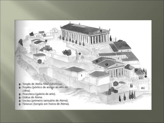 A assembléia ateniense podia votar para exilar um cidadão por 10 anos se suspeitassem de sua lealdade ou honestidade, escrevendo seu nome em pedaços de cerâmica chamados de ostraka. A Acrópole de Atenas era o centro religioso elevado da cidade, onde ficava o Parthenon dedicado à deusa Atena.