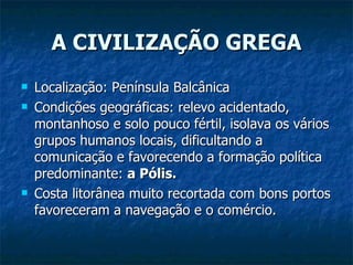 1) A Grécia Antiga foi marcada por diversos períodos desde as origens até o período Arcaico, com destaque para as invasões dórias e o surgimento da pólis.
