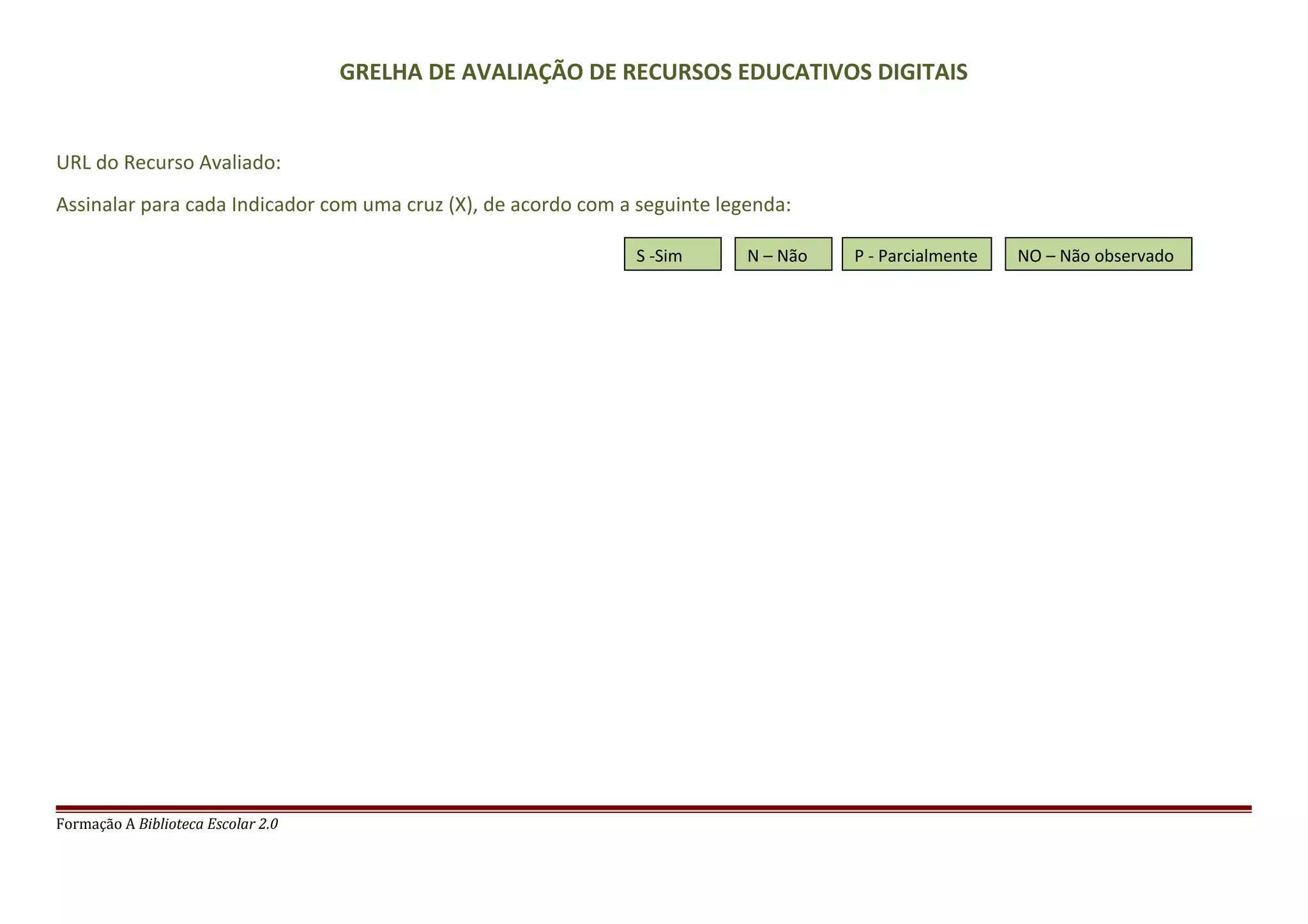 O documento fornece uma grelha de avaliação para recursos educativos digitais. A grelha avalia o tema, autoria, conteúdo, qualidade contextual, aspectos técnicos e estruturais do recurso. Fornece indicadores para cada critério e uma legenda para assinalar se o indicador é Sim, Não ou Parcialmente observado no recurso.