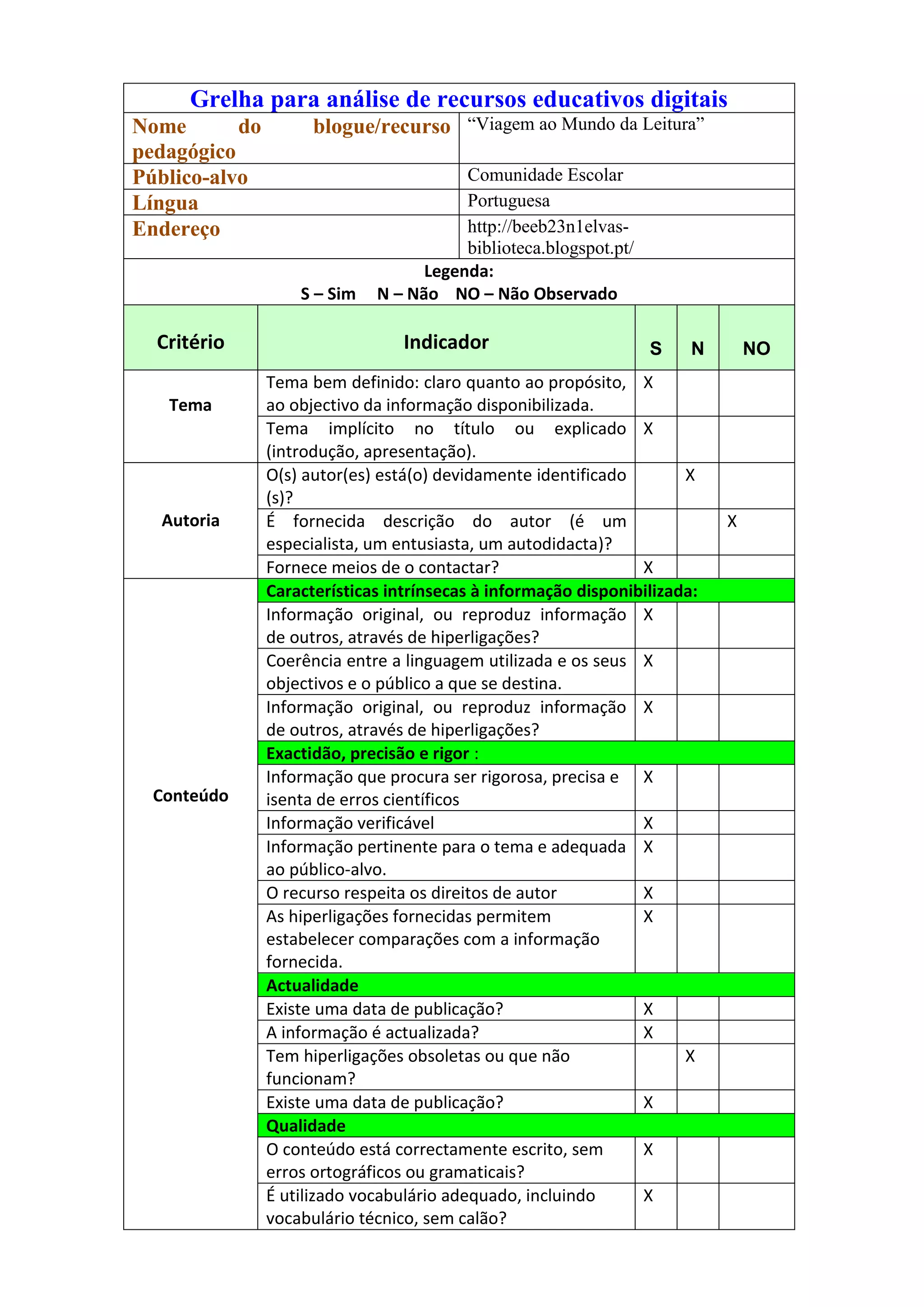 Este documento analisa o recurso educativo digital "Viagem ao Mundo da Leitura" de acordo com vários critérios como tema, autoria, conteúdo, acesso, usabilidade, desenho gráfico e multimídia. O resumo indica que o recurso tem um tema bem definido, identifica seus autores, fornece informações precisas e atualizadas, e possui uma boa organização, navegação e acessibilidade.
