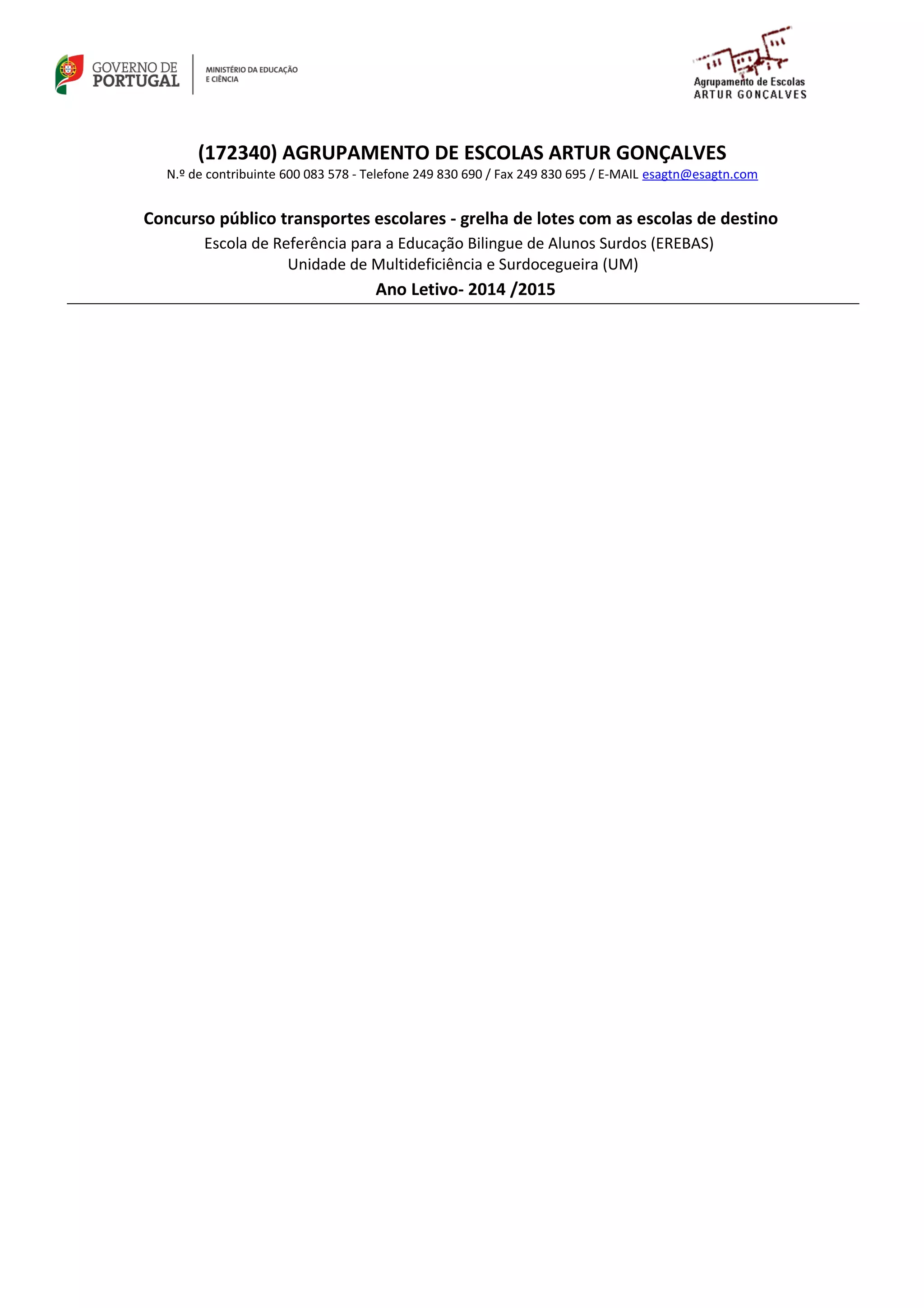 Este documento lista 14 lotes de transporte escolar para várias escolas, incluindo a Escola de Referência para a Educação Bilingue de Alunos Surdos (EREBAS) e a Unidade de Multideficiência e Surdocegueira (UM). Cada lote inclui informações sobre a escola, ano letivo, morada, freguesia, horário de entrada e saída.