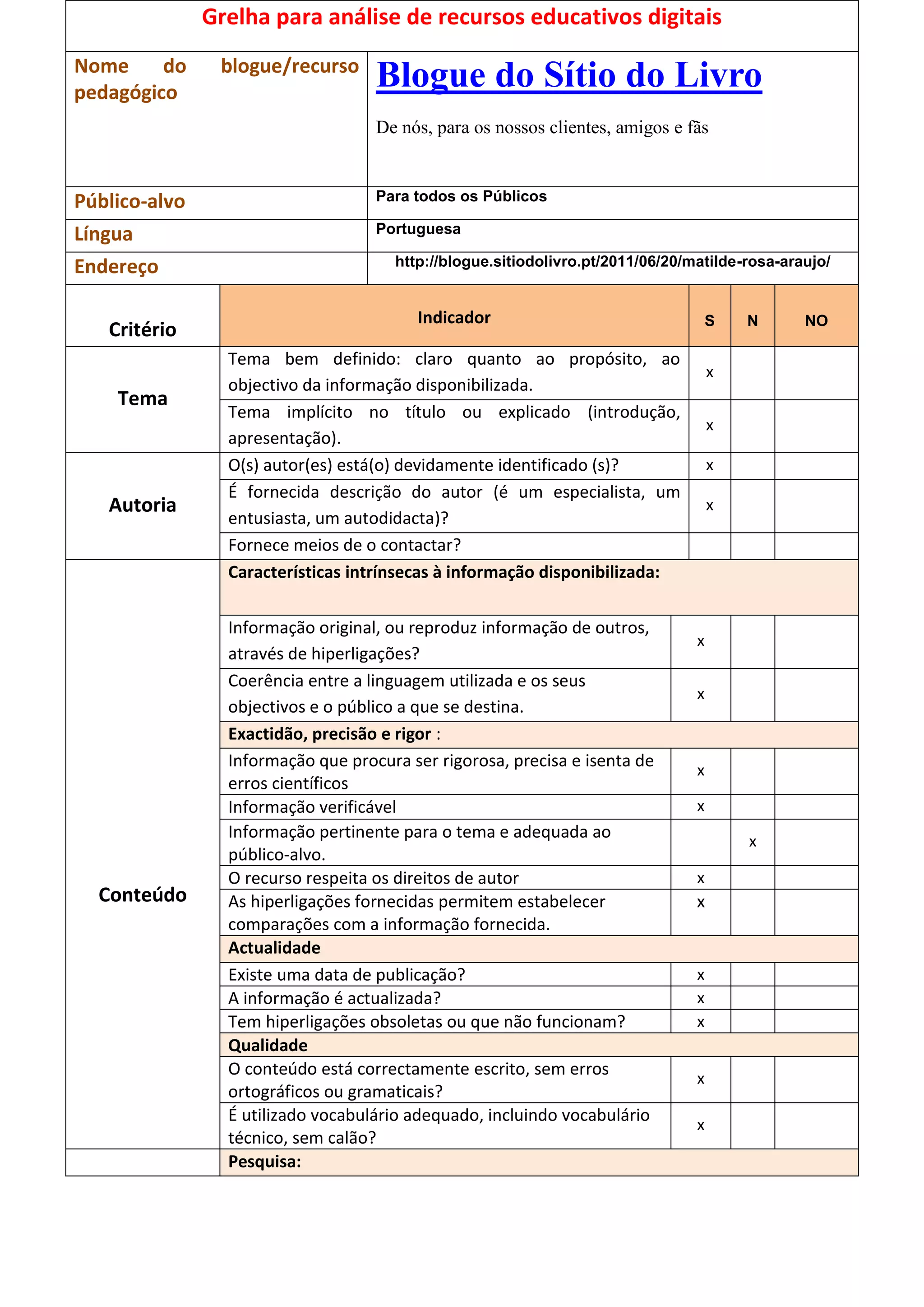 Este documento fornece uma grelha para analisar recursos educativos digitais, avaliando critérios como o tema, autoria, conteúdo, acesso, usabilidade, design gráfico e multimídia. A grelha é aplicada para analisar o blogue "Sitio do Livro" que contém informações sobre a autora portuguesa Matilde Rosa Araújo.