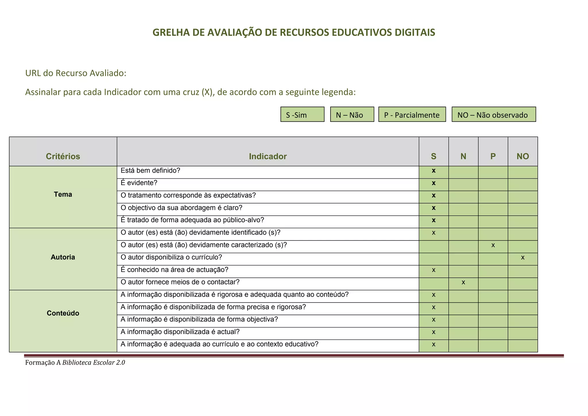 [1] Este documento fornece uma grelha de avaliação para recursos educativos digitais, com critérios como tema, autoria, conteúdo, qualidade contextual, utilidade, actualidade, relevância, aspectos técnicos e estruturais, navegação, comunicação, custos e acessibilidade.