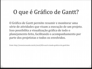 Um Gráfico de Gantt permite resumir e monitorar as atividades de um projeto, visualizando graficamente o planejamento para facilitar o acompanhamento. É possível criar esses gráficos no Excel para projetos simples, mas para projetos maiores são recomendados programas mais sofisticados. Os elementos essenciais de um Gráfico de Gantt incluem início e fim do projeto e das atividades, duração das atividades, folga e atividades críticas.