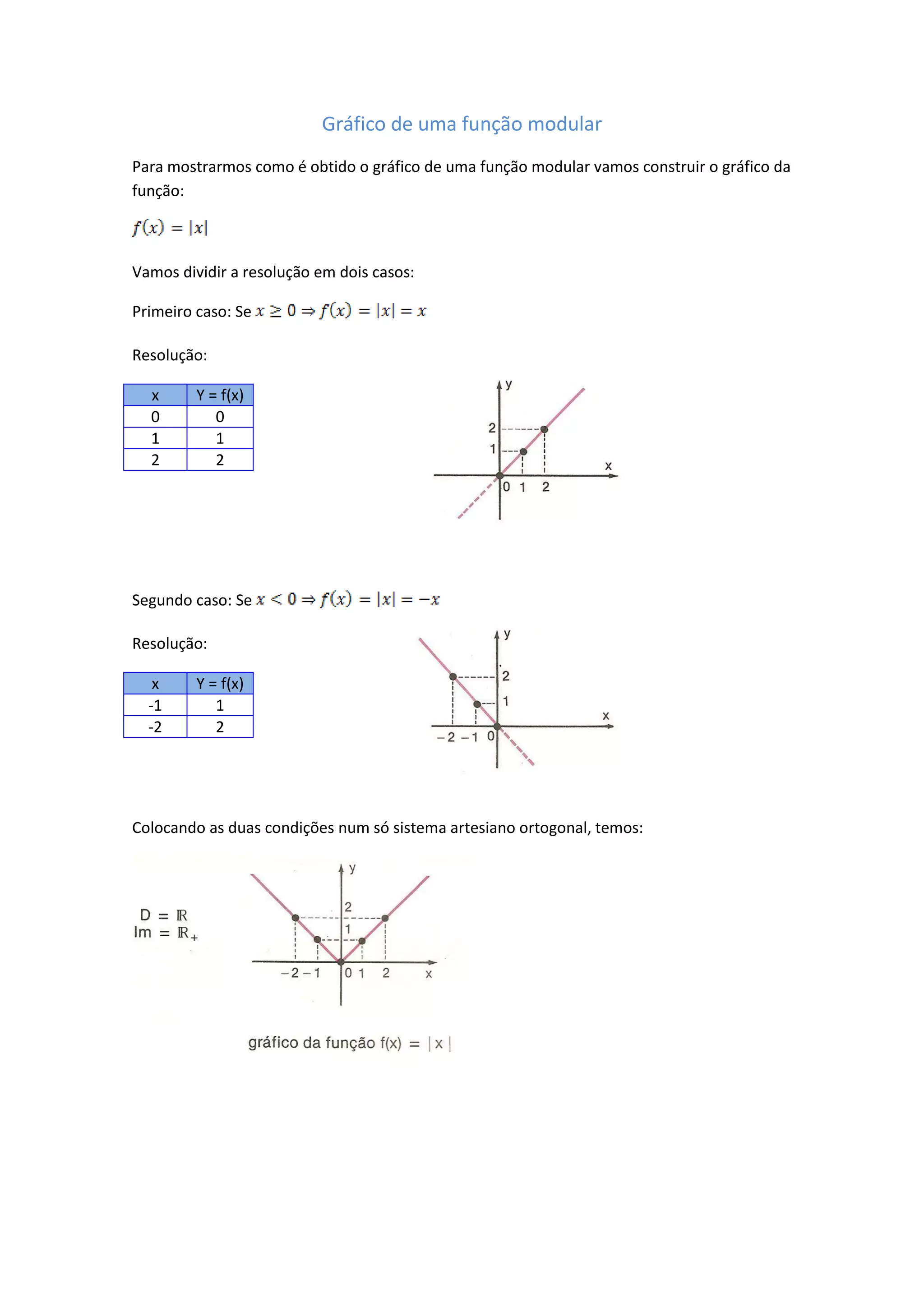 Este documento descreve como construir gráficos de funções modulares dividindo-os em dois casos: quando x é positivo e quando x é negativo. Dois exemplos são dados para ilustrar como plotar pontos (x, y) em cada quadrante e então combiná-los em um único gráfico. O texto é retirado de um livro de matemática do segundo grau sobre conjuntos, funções e progressões.