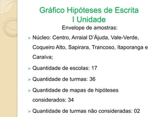 Este documento apresenta os resultados de dois mapas de hipóteses de escrita de alunos do 3o ano do Programa Nacional pela Alfabetização na Idade Certa (PNAIC). O primeiro gráfico mostra que 72 alunos estão no estágio pré-silábico, 95 no silábico e 122 no silábico-alfabético de um total de 521 alunos avaliados. O segundo gráfico indica que 20 alunos estão no estágio pré-silábico, 48 no silábico e 68 no silábico-alfabético