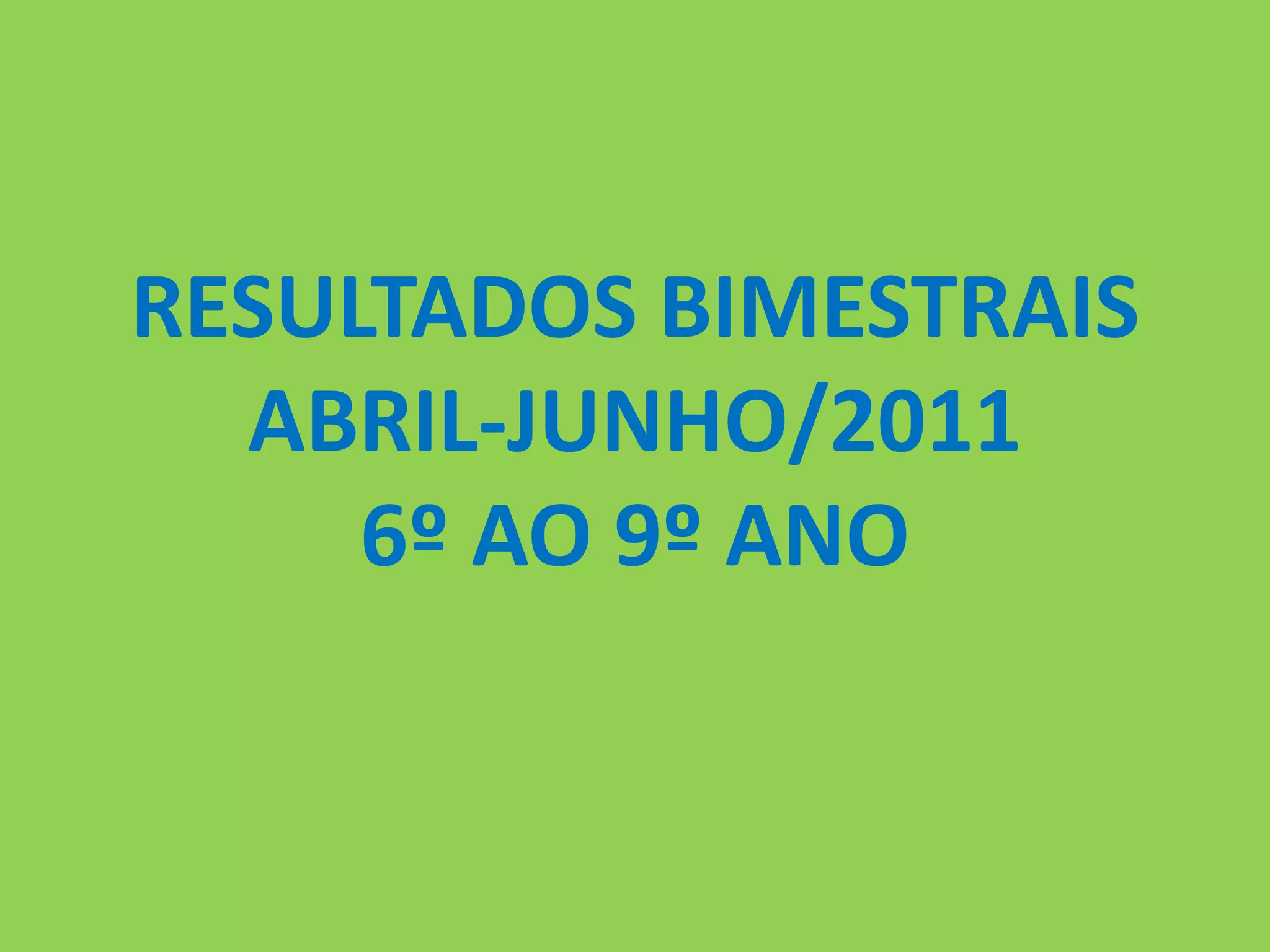 O documento apresenta os resultados bimestrais de abril a junho de 2011 para alunos do 6o ao 9o ano em diferentes escolas. As médias em matemática e ciências são comparadas entre escolas e bimestres. A média geral em matemática foi de 5,39 no 1o bimestre e 6,31 no 2o bimestre. Em ciências, a média geral foi de 4,14 no 1o bimestre e 4,81 no 2o bimestre.