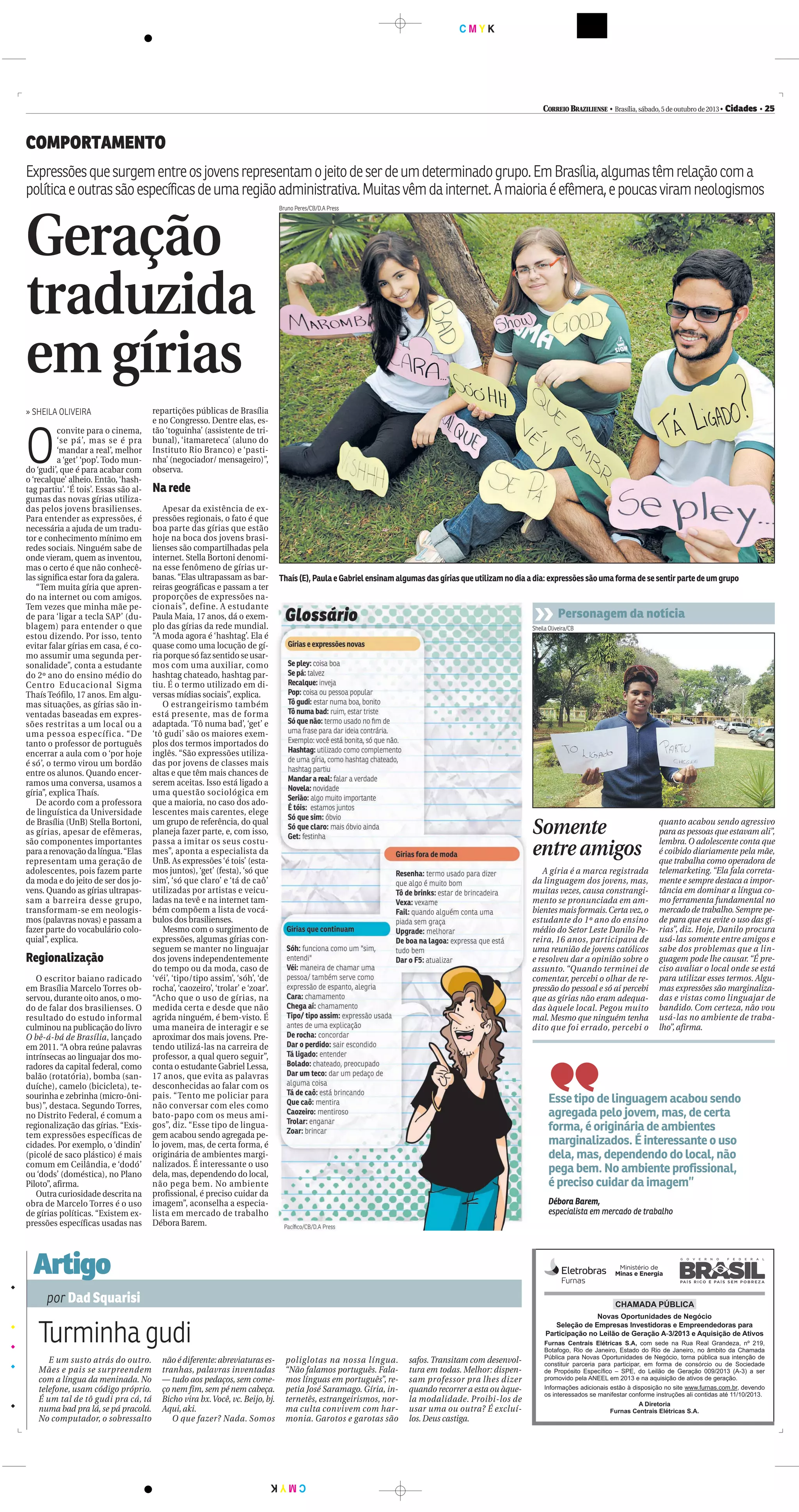 O documento discute o uso de gírias entre os jovens brasilienses, como representam a identidade de um grupo e variam de acordo com a região. Muitas vêm da internet e são compartilhadas nacionalmente, enquanto outras são específicas do Distrito Federal. Embora efêmeras, algumas expressões acabam se tornando neologismos.