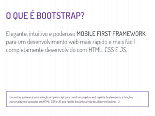 O documento aborda o Bootstrap 3, um framework mobile first para desenvolvimento web, destacando suas melhorias em relação ao Bootstrap 2.3, como um sistema de grids responsivo baseado em 12 colunas. São apresentadas as classes principais para construção dos grids, que são .container, .row e .col-xx-yy, essenciais para o design responsivo. Além disso, o texto inclui exemplos práticos e referências para mais informações sobre a utilização do grid.